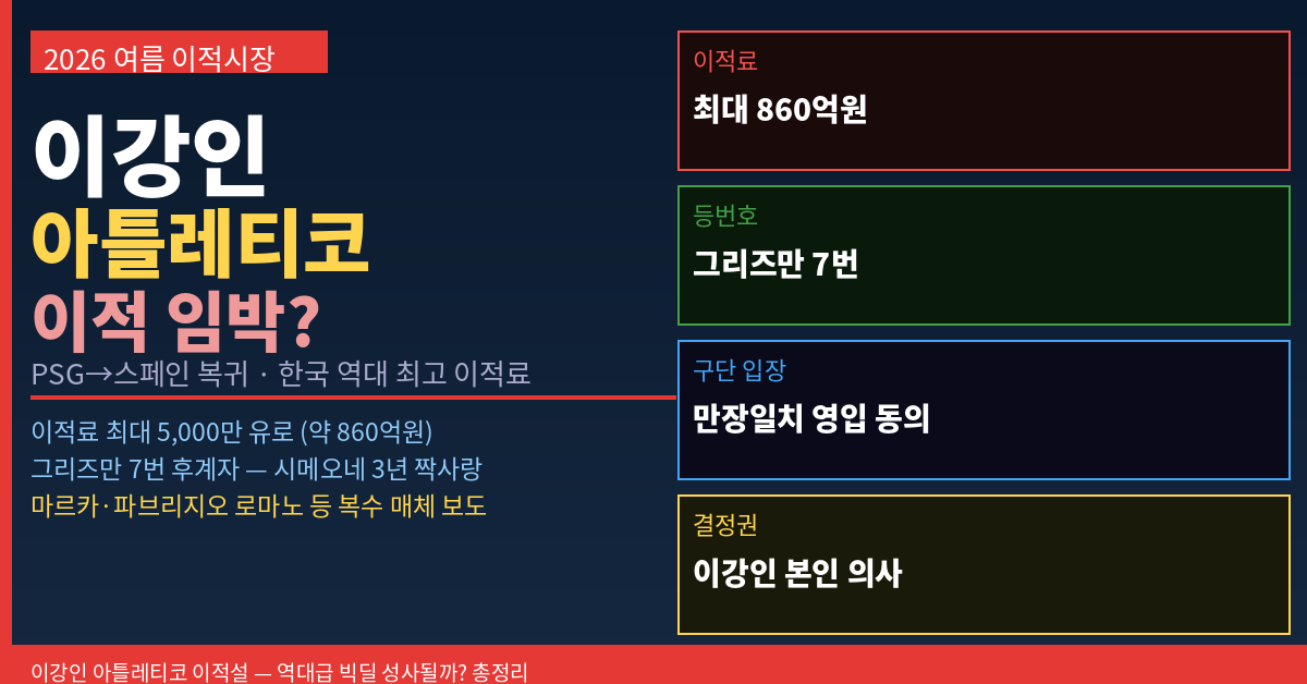 #이강인이적 #이강인아틀레티코 #이강인PSG #아틀레티코마드리드 #이강인이적료 #이강인860억 #그리즈만후계자 #이강인스페인 #한국축구이적 #이강인2026 #라리가이적 #이강인소식